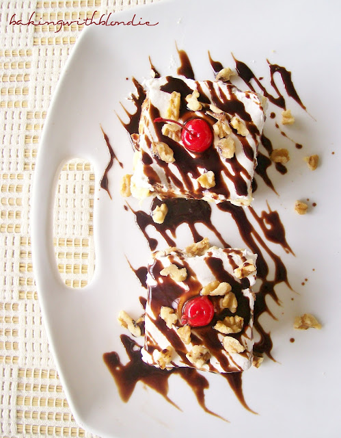 When I was flipping through this cookbook for the first time, this recipe jumped right off the page. I thought it was hilarious how at the bottom of the recipe it warned: this dessert is very rich. Hah! No, really? I mean with all the fixings that go sweetly along with your typical banana split dessert smothered on a cake, how could this not be perfectly dangerous?