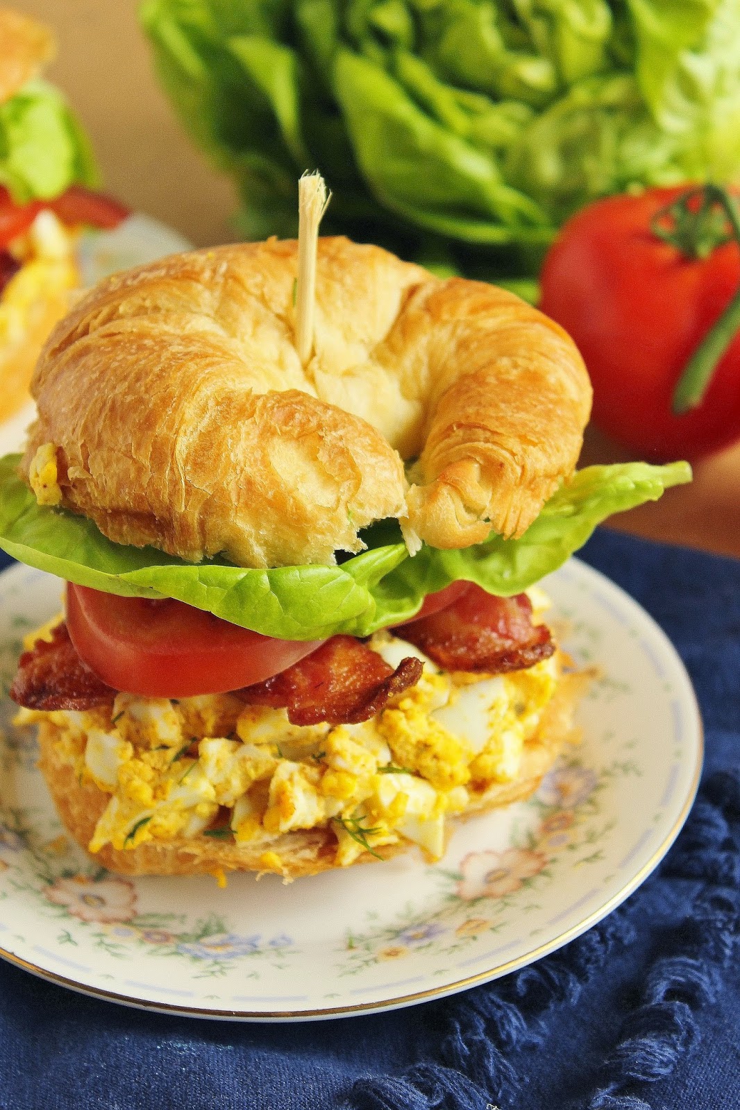 2. Spread about 1/4-1/2 egg salad mixture onto the bottom layer of the croissant sandwich. Next, layer on the crispy bacon, juicy tomatoes, and lettuce. Top with the top half of the croissant sandwich, and serve warm or cold (right away is best).